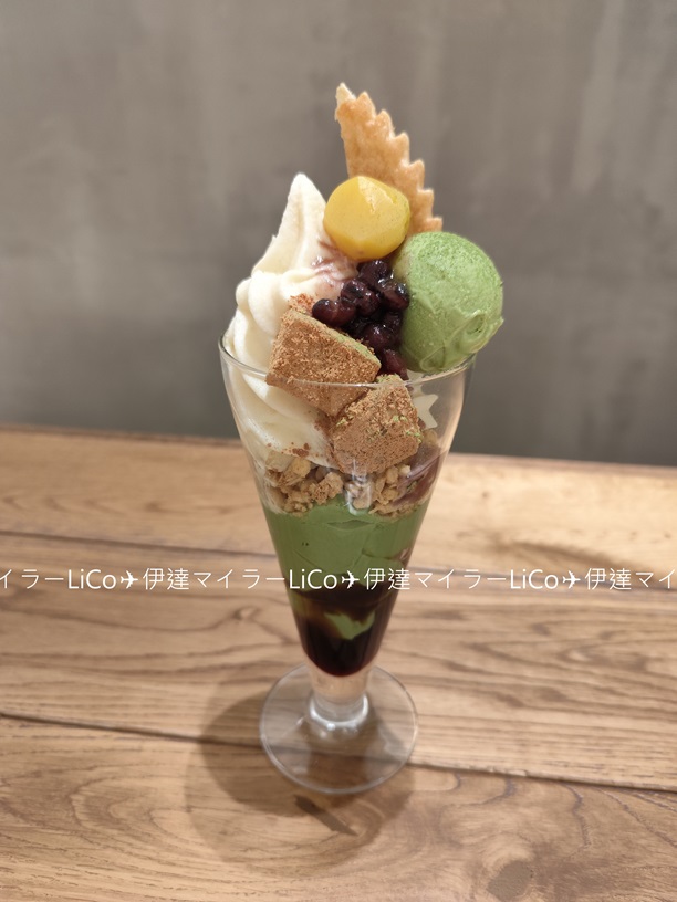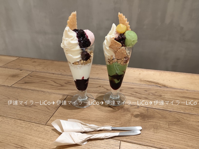 右:なかほら牧場ソフトクリーム 宇治抹茶とわらび餅のパフェ🍃