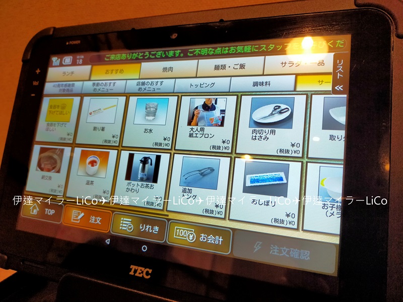 ポットのお茶のお替わりや、温かいお茶やお水、エプロンやおしぼりなど、無料でオーダー出来るのが便利🥰
