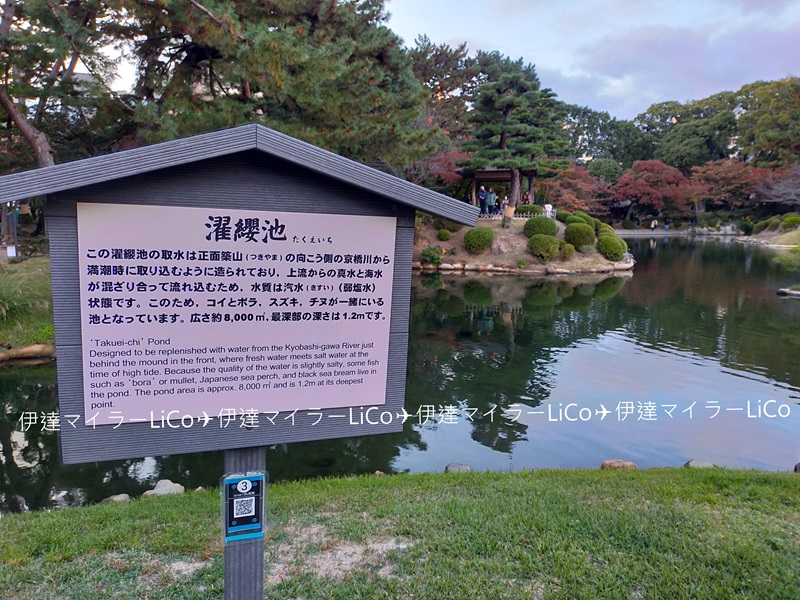 「濯纓池」の水は、北側を流れる京橋川から引いていますが、河口に近い場所にあるため、淡水と海水が混ざる、汽水となっているそうです。