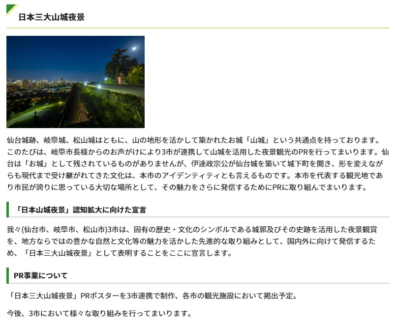 宮城県仙台市(仙台城跡)、岐阜県岐阜市(岐阜城)、愛媛県松山市(松山城)の各市にある山城(跡)から見渡す市街地の夜景を3市が連携してアピールする取り組みがスタートしています✨